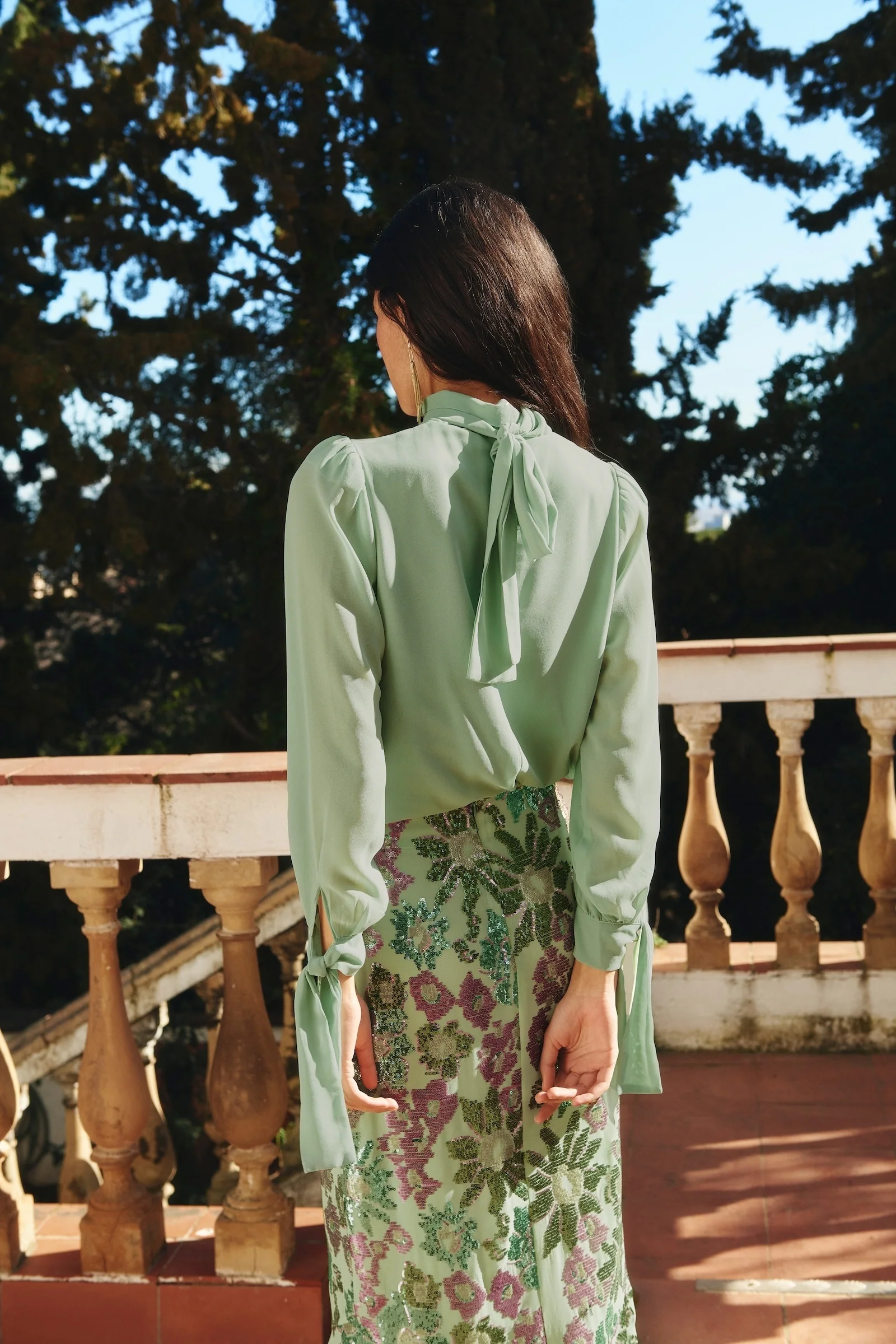 This skirt pairs perfectly with our semi-transparent light green shawl.