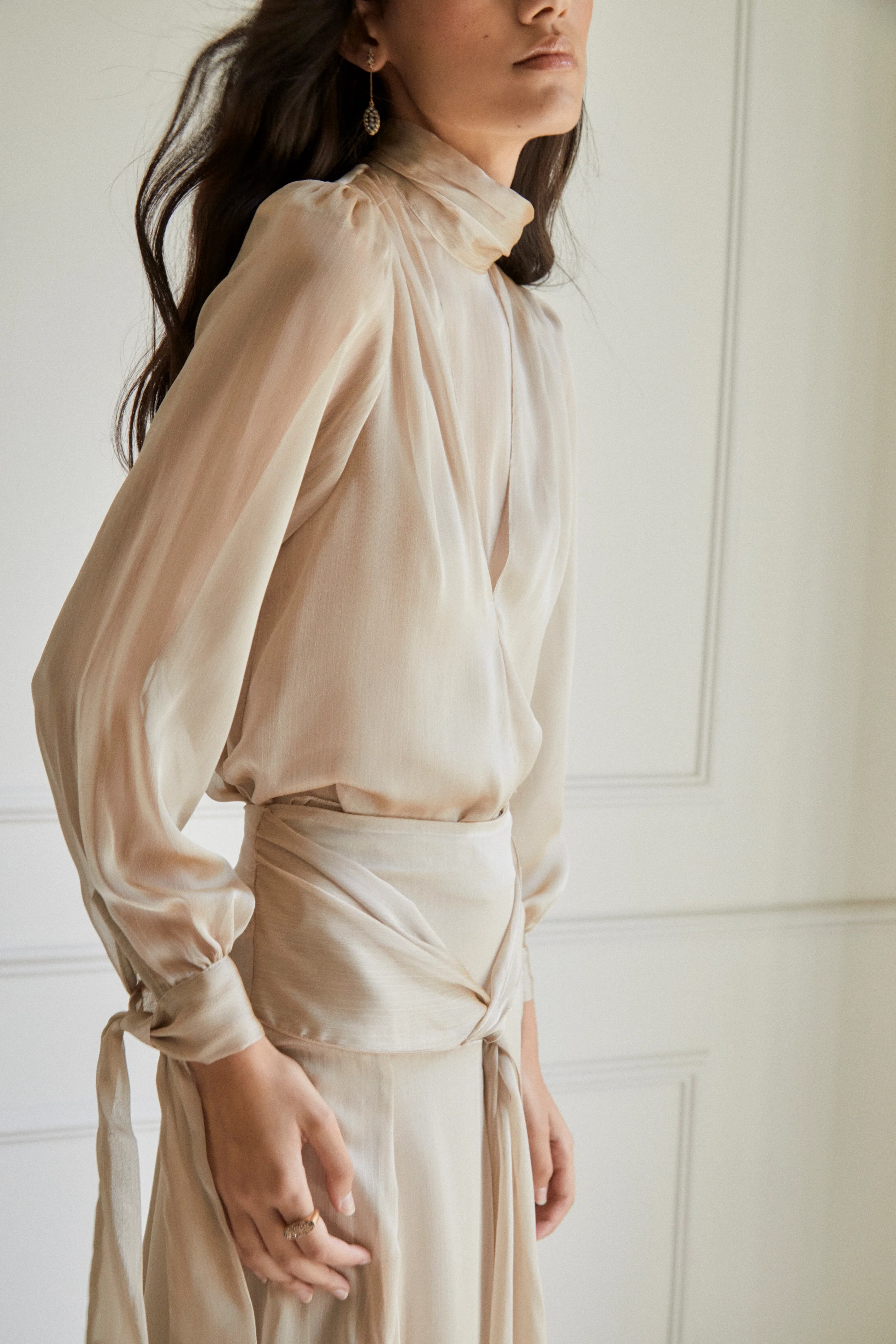 The Christy blouse in pearl, crafted from delicate crinkled chiffon, stands out for its sophisticated and feminine design. The garment subtly plays with transparency through the strategic placement of fabric layers that add depth while maintaining lightness.