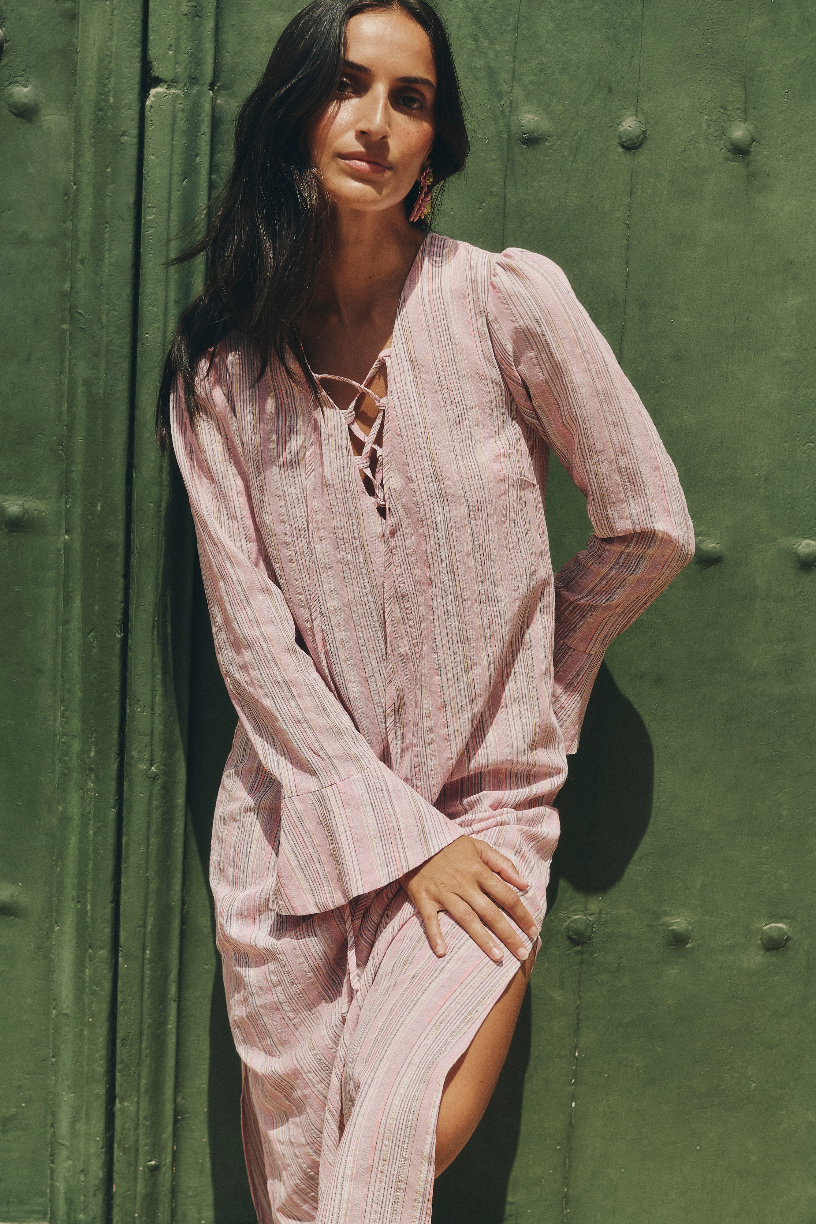 The Costa tunic stands out with its cotton fabric featuring multicolor stripes in pink tones, ideal for the hottest summer days. It features a V-neckline, adorned with adjustable crossed ties that allow you to regulate it to your liking. The long sleeves end in cuffs with a subtle bell shape. Its maxi cut and side opening guarantee comfort with every step.