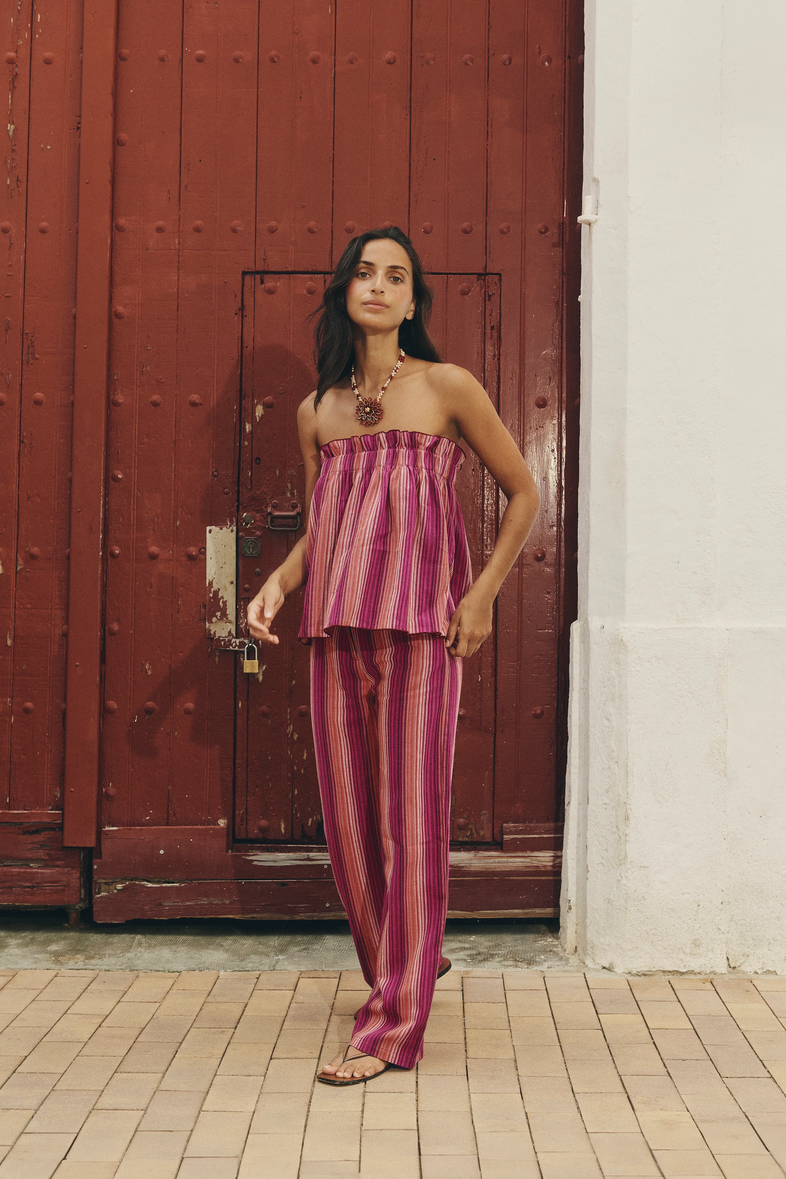 The Faro pants made from cotton fabric with woven stripes in pink, lilac and garnet tones, stand out for their flattering design. Additionally, they feature a waistband with interior button closure and zip fly, along with side pockets.