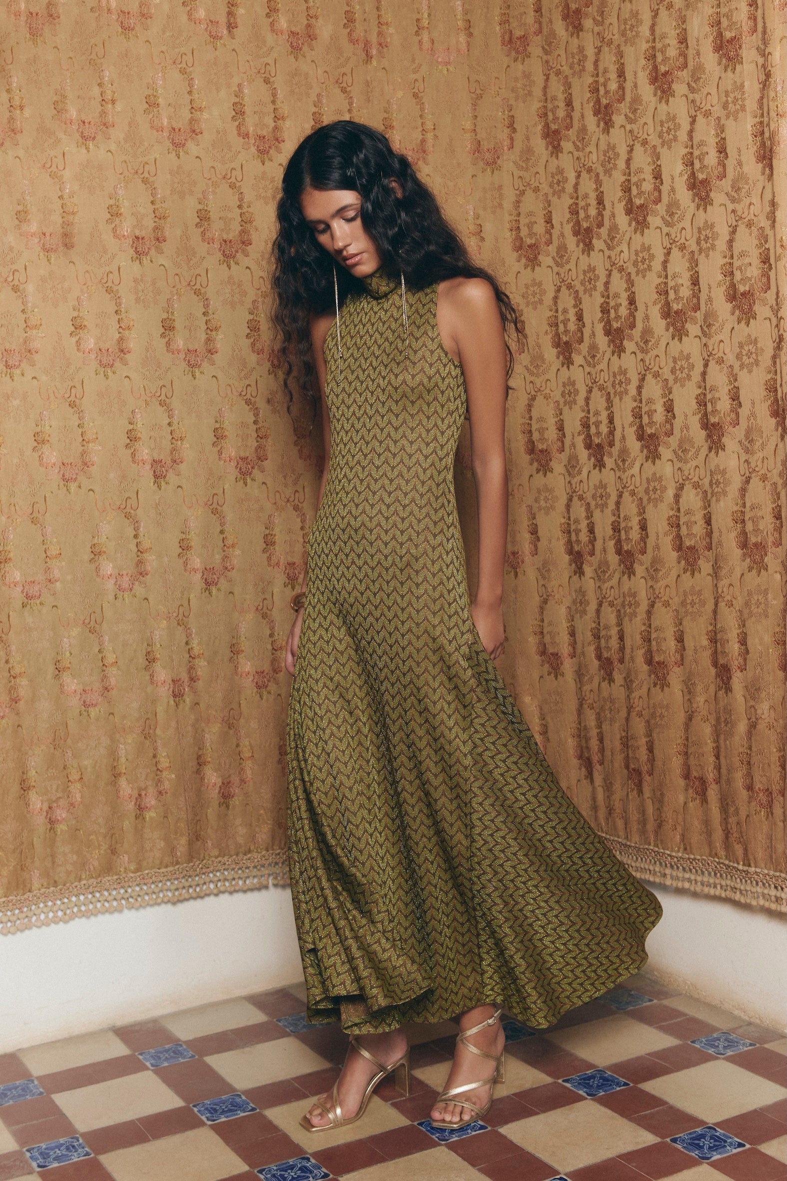 Lea dress in stretch knit with geometric pattern in greenish tones and lurex sparkle.