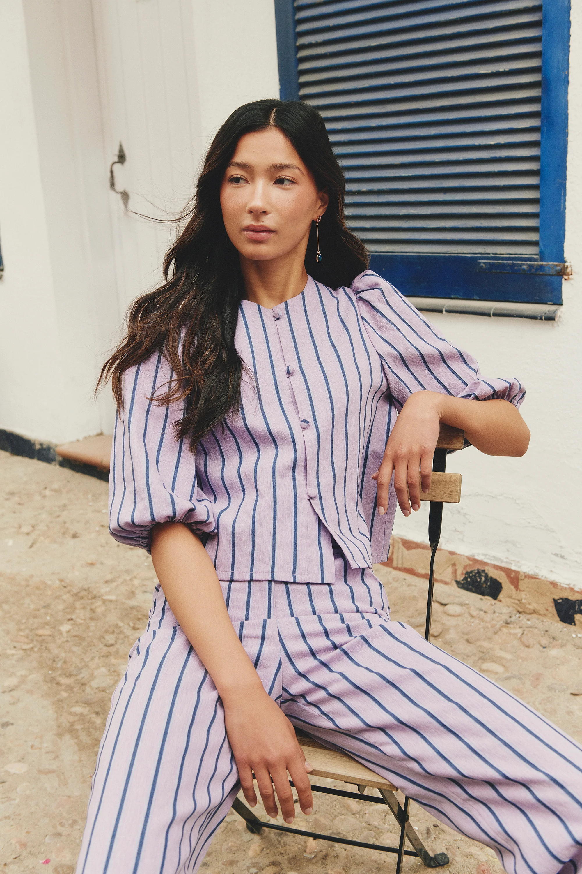 The Marea pants are made from a lilac and navy striped woven linen blend and stand out for their flattering fit. They feature a mid-rise waist and a straight-leg cut. The waistband includes an inner button closure and zip fly, along with side pockets.