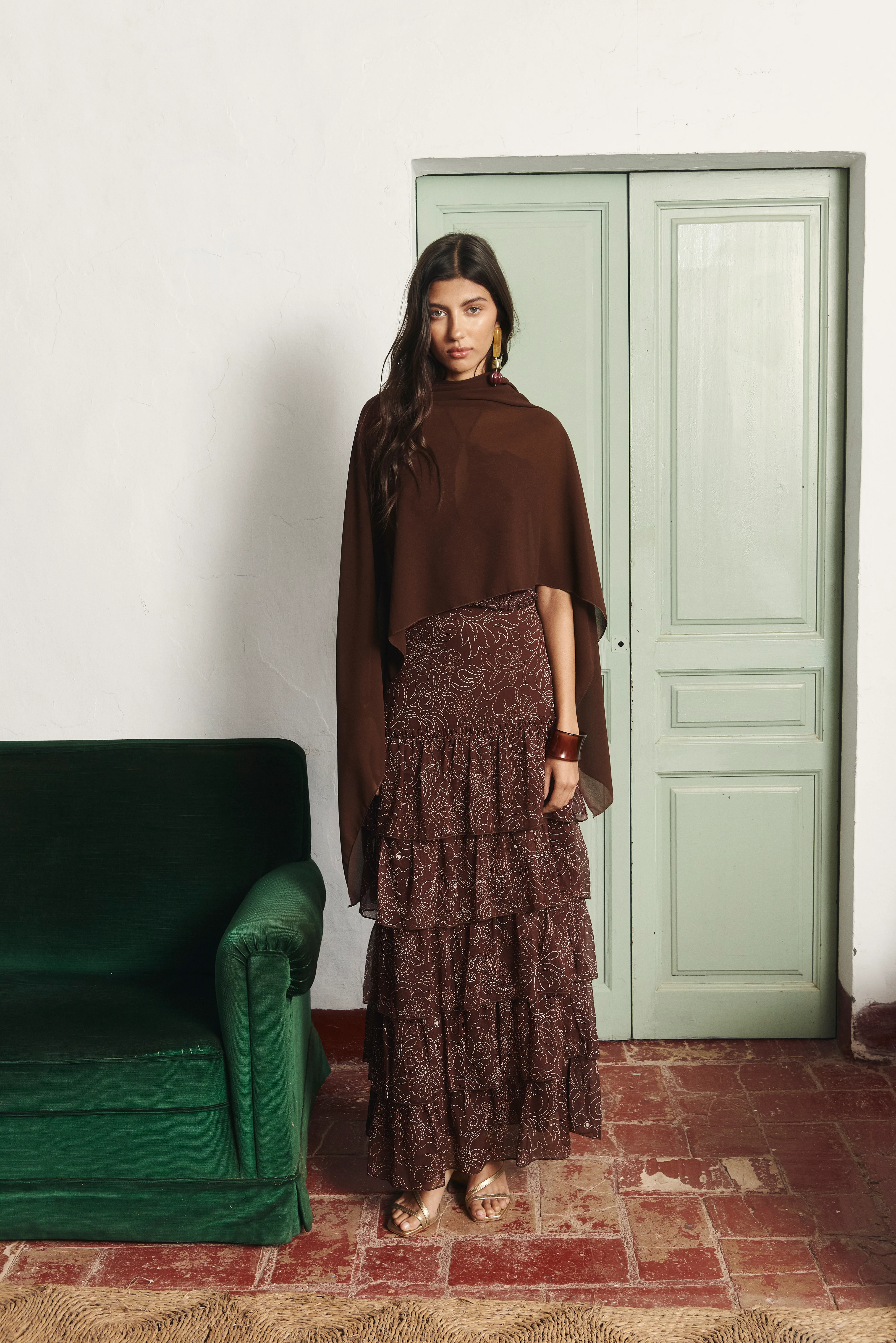 The Morgan Skirt is a brown-toned ensemble featuring a discontinuous stroke print on bambula gauze. Its abundance of ruffles adds an original and elegant touch, making it perfect for special occasions.
