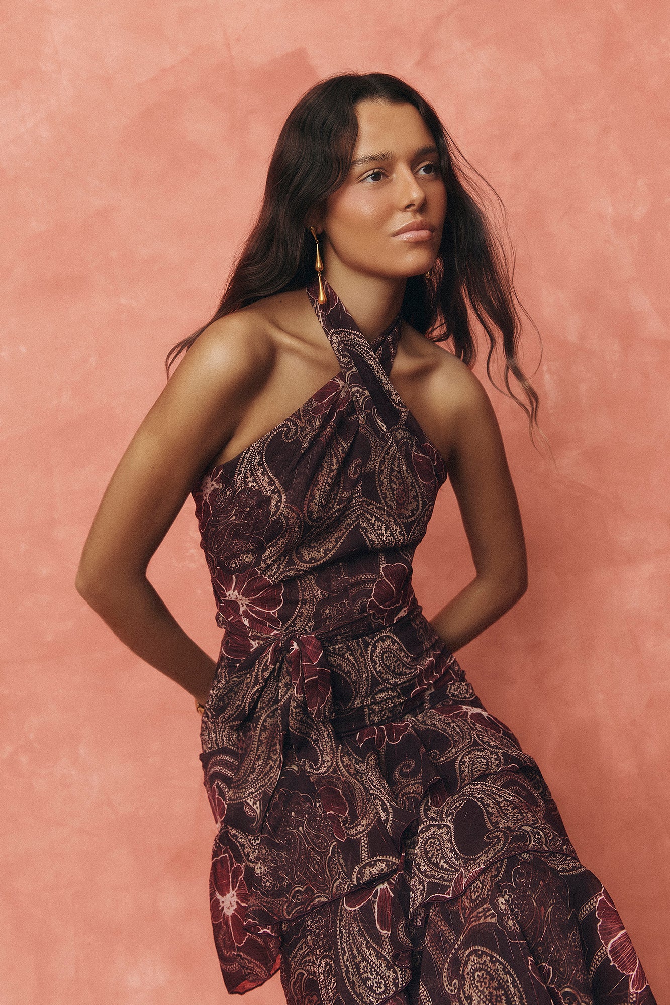 The Sienna set is the ideal look for those seeking a bohemian style with a floral touch. Its print, featuring delicate floral motifs drawn in a natural tone, stands out against a base of eggplant and burgundy shades. All this on a bamboo gauze fabric that includes subtle details of metallic thread in golden tones, providing a discreet and elegant shimmer.